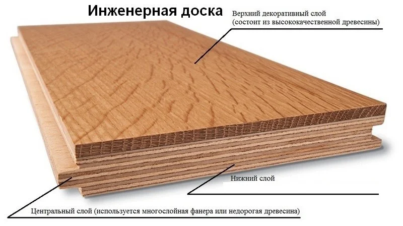 Инженерная доска представляет собой внешне с лицевой стороны полный аналог массивной доски, кроме не цельной древесины. Которая состоит из 2-х частей : натуральный слой цельной породы, будь то Дуб или другая порода, и нижний слой — это основание твердой фанеры устойчивой к перепадам влажности. И все это скрепляется специальным клеем на заводе. Данный вид доски один из самых стабильных в эксплуатации и поэтому размеры можно изготавливать любые, даже шириной в 30-50 см. Подобный вариант доски используется когда высокий риск сильных перепадов температур. Монтаж инженерной доски похож на укладку цельного массива. Кроме то, укладка инженерной доски по технологии монтажа, легче, быстрее и дешевле. Требования по температуре и влажности в помещении, не являются строгими.