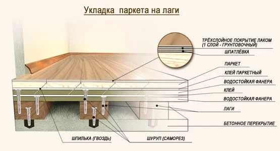 Лаги укладываются на бетонное основание с шагом 25-30 см, перпендикулярно направлению будущей укладки паркета. Крепятся лаги к основанию саморезами на дюбелях. Шаг крепления дюбелей 45-50 см. Перед закреплением лаги выравниваются по общему горизонтальному уровню, во всех направлениях. То есть горизонтальность уровня лаг проверяется по длине лаг, перпендикулярно лагам, и по диагоналям. При этом шляпки саморезов не должны торчать, а должны быть утоплены на 3-4 мм. Между торцами лаг оставляется температурный шов 1-2 см.