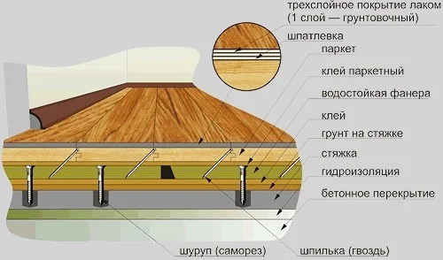 Для долгого срока службы паркетного пола, перед укладкой паркета проводится аудит основания. Его поверхность должна быть ровной. Правилом длинной 2 метра проверяется плоскость, отклонение не должно превышать 2 мм. на длину. По результатам следует выровнять поверхность. Это возможно сделать двумя способами: