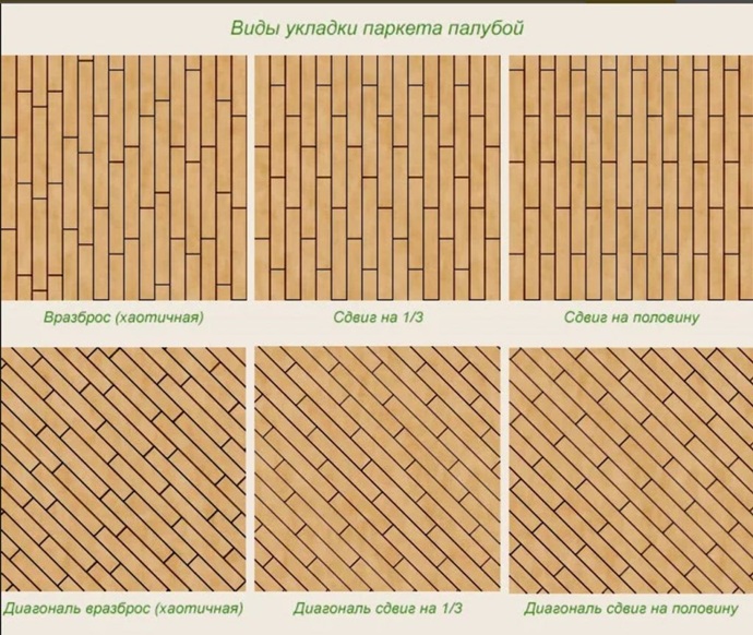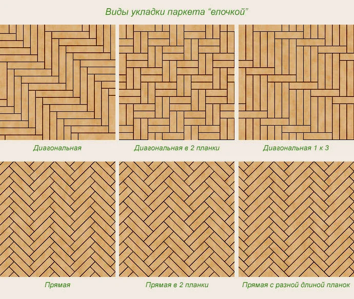 Укладка штучного паркета выгодно отличается от остальных разновидностей. Размер планки позволяет комбинировать направления. Итогом комбинаций можно получить различные узоры. Наиболее известны следующие узоры: